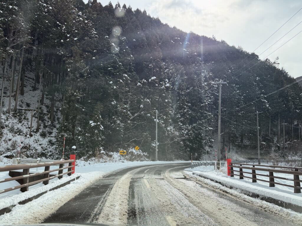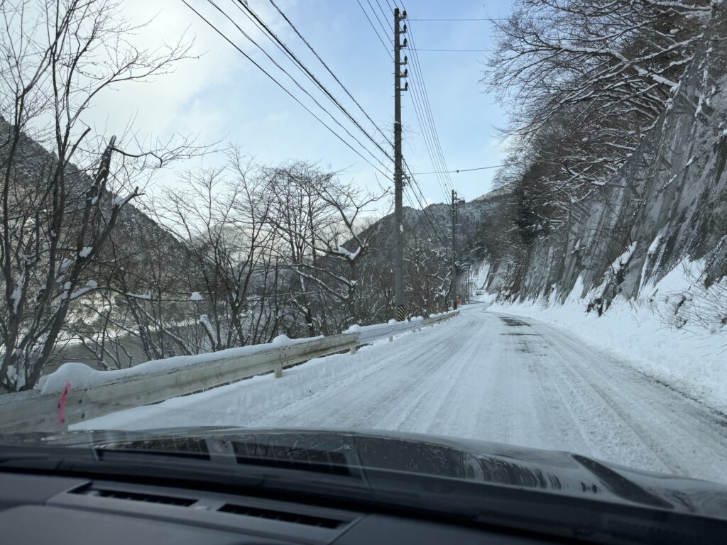 道の駅を過ぎると路面に雪が残るように。それでも除雪はしっかりされてます。