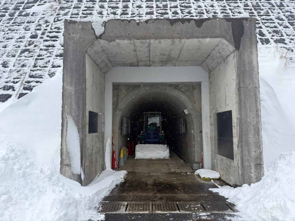 山肌をくり抜いたような倉庫。いつもは扉が閉まってるのですが、今日は開いてました。除雪機が格納されているんですね。