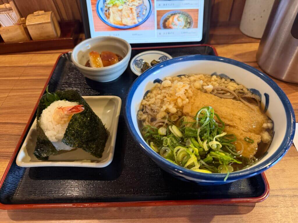 岐阜のソウルフードは冷やしたぬき。ここも冷やしたぬきが美味しいんですが、寒いんで温かいたぬき蕎麦と天むすのセットを注文。