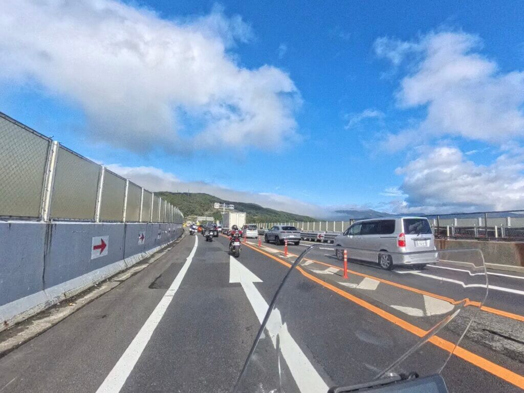 高速道路リニューアルプロジェクトの一環で、1986年完成から40年近く経つ岡谷高架橋の改良補強工事がずっと行われており、今日もそれほど酷くはないけど合流部分で渋滞。